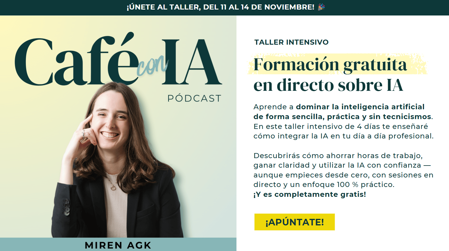 Tengo una confesión: Echo de menos los días en los que conocía personalmente a todos mis seguidores de LinkedIn. Por aquel entonces, siempre que conectaba con alguien nuevo, le mandaba un mensaje: "Hey, encantada de saludarte, ¿te apetece que nos tomemos un café virtual de 15 minutos para conocernos mejor?". Y, para mi alegría, la mayoría de la gente aceptaba. Así conocí a Cristina, Jorge, Inge, Nico, Iván, Rosa, y tantos otros. Y me encantaba esa conexión humana, genuina, de sentarnos a charlar sobre nuestros nichos, en mi caso la IA, con pasión y sin guiones. ¿Por qué te cuento esta ñoñada? Pues porque quiero recuperar esas conversaciones, pero a una escala mayor. Y, por eso, me hace muchíiiiiiisima ilusión presentarte mi nuevo pódcast: Café con IA 🎉. Lo que es aún mejor: para celebrar su lanzamiento, voy a impartir una formación de 4 días sobre inteligencia artificial, completamente gratuita y en directo. Y, cómo no, estás invitadísimo. ¡Reserva tu plaza para el taller intensivo de Café con IA! Esto es todo lo que aprenderás: ✅ Escribir prompts irresistibles con el método ROCE Apunta: ↳ Fecha: del 11 al 14 de noviembre Estoy DESEANDO que llegue la semana que viene. Si tú también estás igual… ¡Apúntate al taller intensivo de Café con IA! Por cierto… Si conoces a alguien que sabes que tiene que ponerse al día con la IA, reenvíale este email y anímale a que venga también. ¡Esta formación está abierta a todo el mundo, incluso si empiezas desde cero! Nos vemos en las sesiones en vivo. Un abrazo, Miren :) |